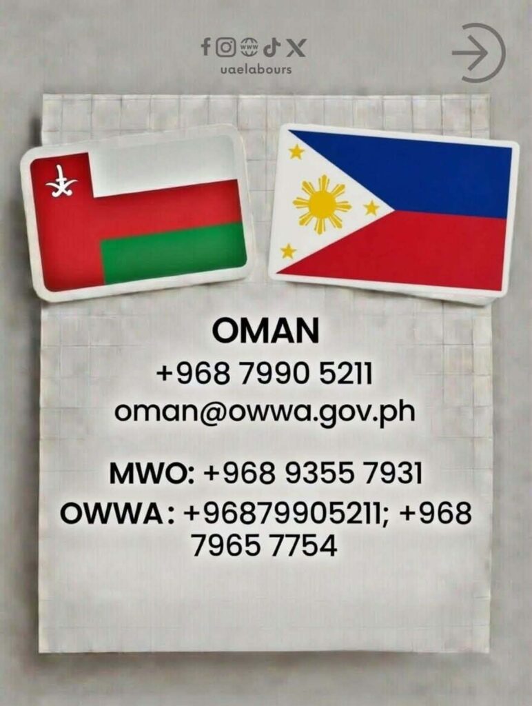 Para sa ating mga kababayan sa Oman, narito ang isang mahalaga at komprehensibong listahan ng mga hotline numbers na dapat ninyong malaman at i-save sa inyong mga telepono para sa inyong seguridad, kalusugan, at mga usaping may kinalaman sa inyong trabaho.
