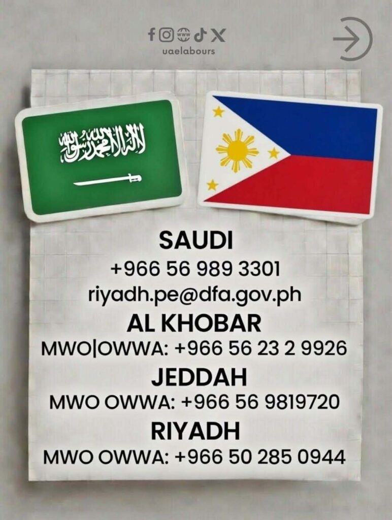 Para sa ating mga kababayan sa Saudi Arabia, napakahalagang i-save ang mga opisyal na contact number na ito. Dahil sa laki ng bansa, tandaan ang iyong lokasyon (Riyadh o Jeddah/Western Region) dahil magkaiba ang sakop na hurisdiksyon ng ating mga embahada at konsulado.