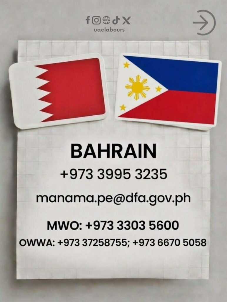 Para sa ating mga kababayan sa Bahrain, mahalagang malaman at i-save ang mga sumusunod na hotline numbers para sa inyong seguridad, kalusugan, at mga usaping may kinalaman sa inyong trabaho.