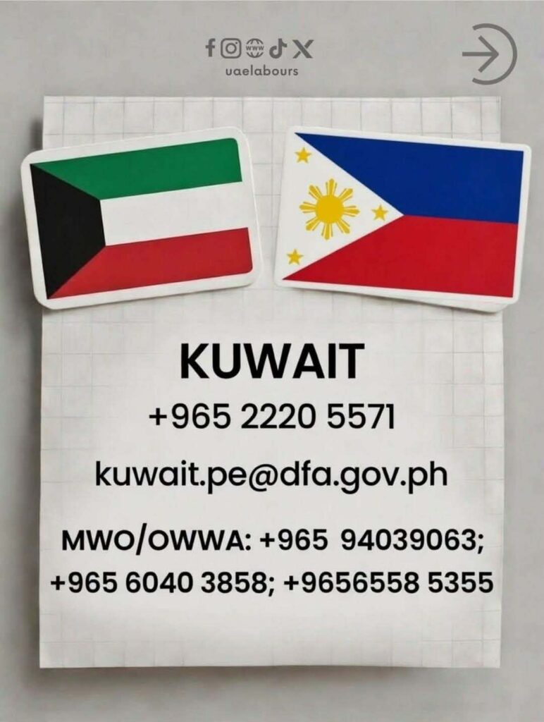 Para sa ating mga kababayan sa Kuwait, napakahalagang malaman at i-save ang mga sumusunod na hotline numbers para sa inyong seguridad, kalusugan, at mga usaping may kinalaman sa inyong trabaho.