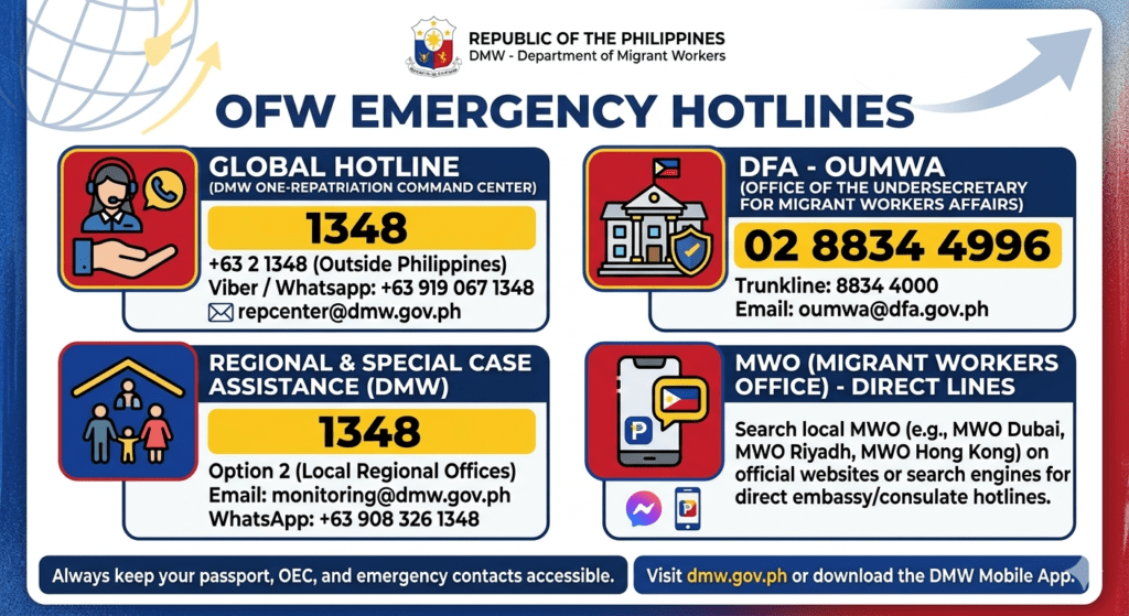 Tandaan: Ang gobyerno ng Pilipinas ay nagpapatupad ng “Free Repatriation.” Huwag mag-atubiling tumawag kung sa tingin niyo ay hindi na ligtas ang inyong kinaroroonan.