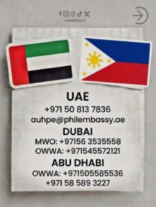 Para sa ating mga kababayan sa United Arab Emirates (UAE), narito ang mahahalagang contact information para sa inyong seguridad, kalusugan, at mga usaping legal. Tandaan…